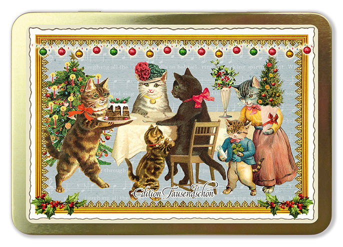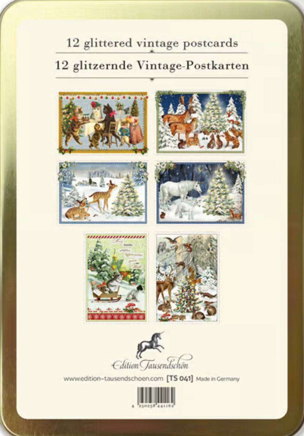 Aufklappbare, goldene Metalldose mit 12 kreativgestanzten Vintage-Glitzer-Postkarten: