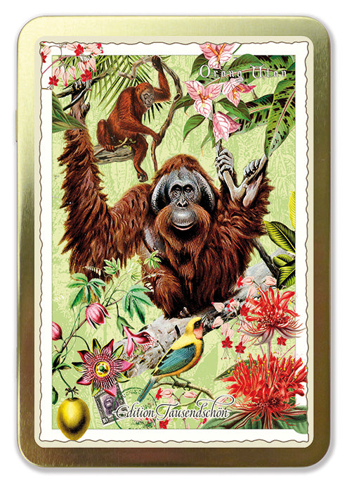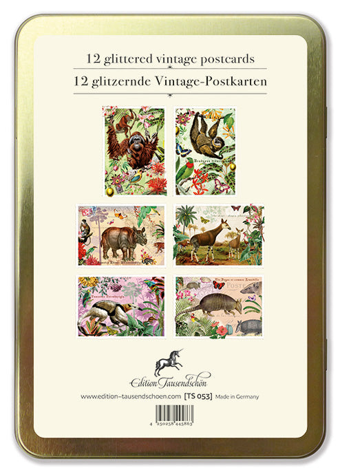 Aufklappbare, goldene Metalldose mit 12 kreativgestanzten Vintage-Glitzer-Postkarten: