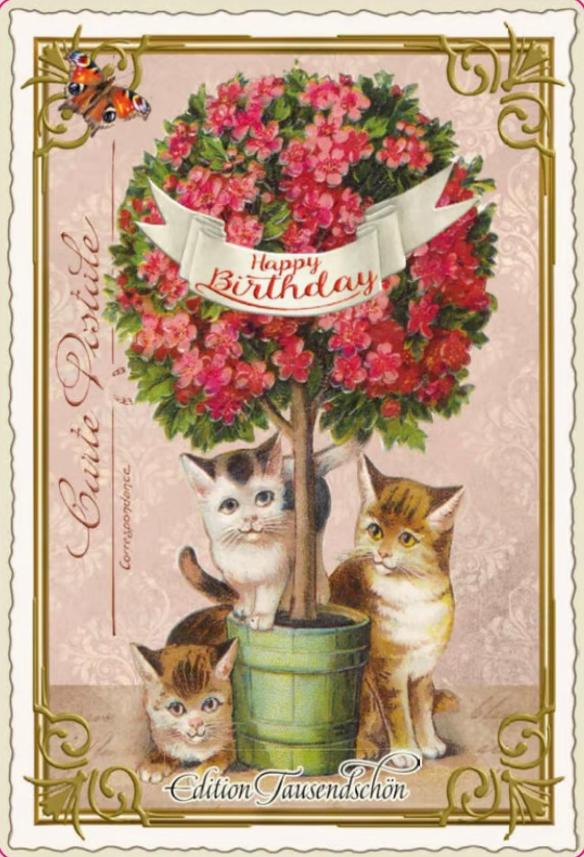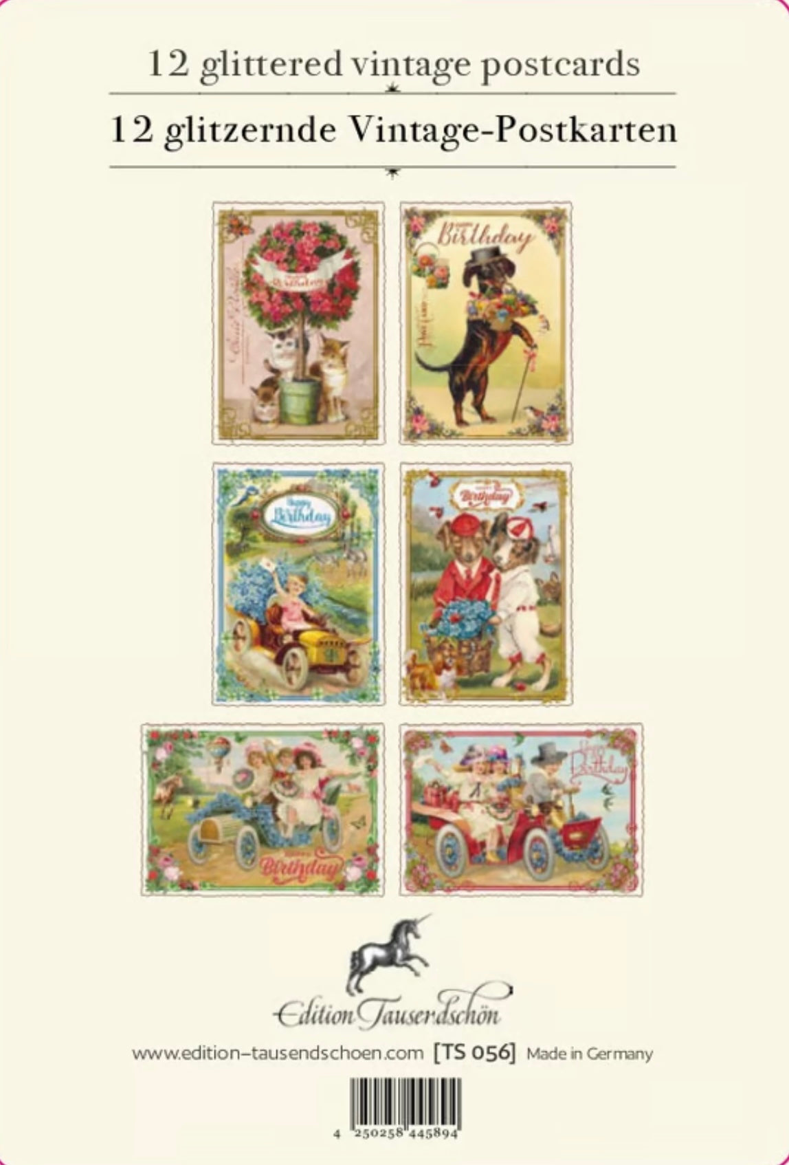 Aufklappbare, goldene Metalldose mit 12 kreativgestanzten Vintage-Glitzer-Postkarten:
